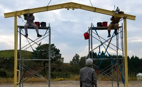当方では、鉄骨制作から組立てまで行うことが可能です。各現場の状況に合わせて、臨機応変に加工することもできます。現場ではクレーンで鉄骨を吊るし、溶接作業で鉄骨同士を接合させ、強固な骨組みを組立てます。